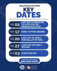 - Early Voting: Early voting is a convenient option for those unable to vote on Election Day. In 2026, early voting runs from February 20th to February 28th. Polling locations are available at county election offices and designated early voting sites. A full list of locations can be found on the [ Texas Secretary of State's Office website ].